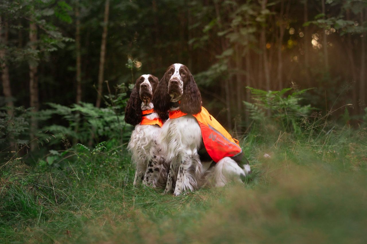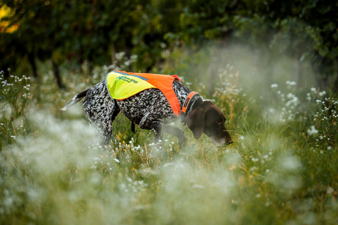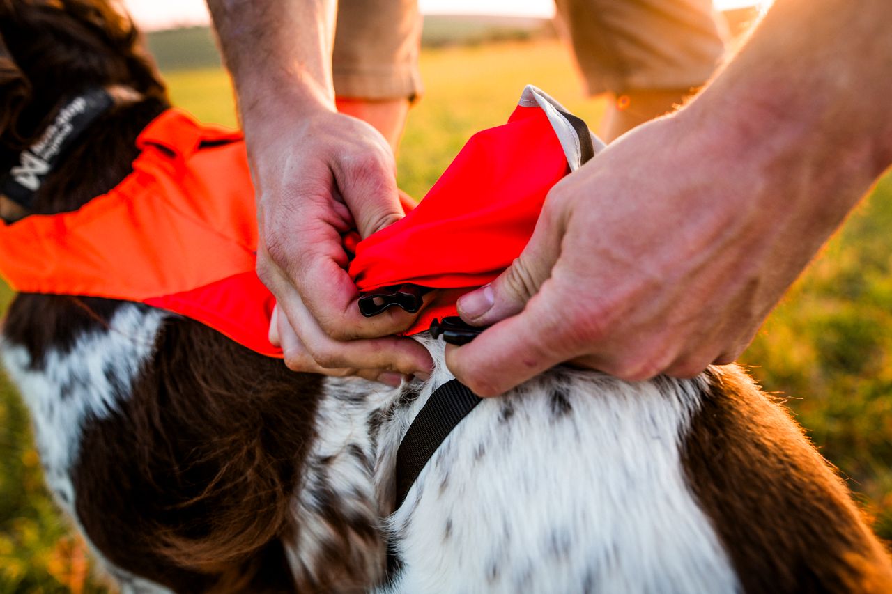 Vesti vasakul küljel on punase kangaga märgis ja paremal pool on erk kollane märgis – tänu sellele näete juba kaugelt kummale poole koer näitab.