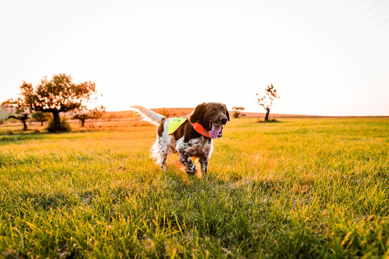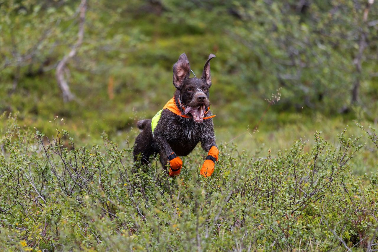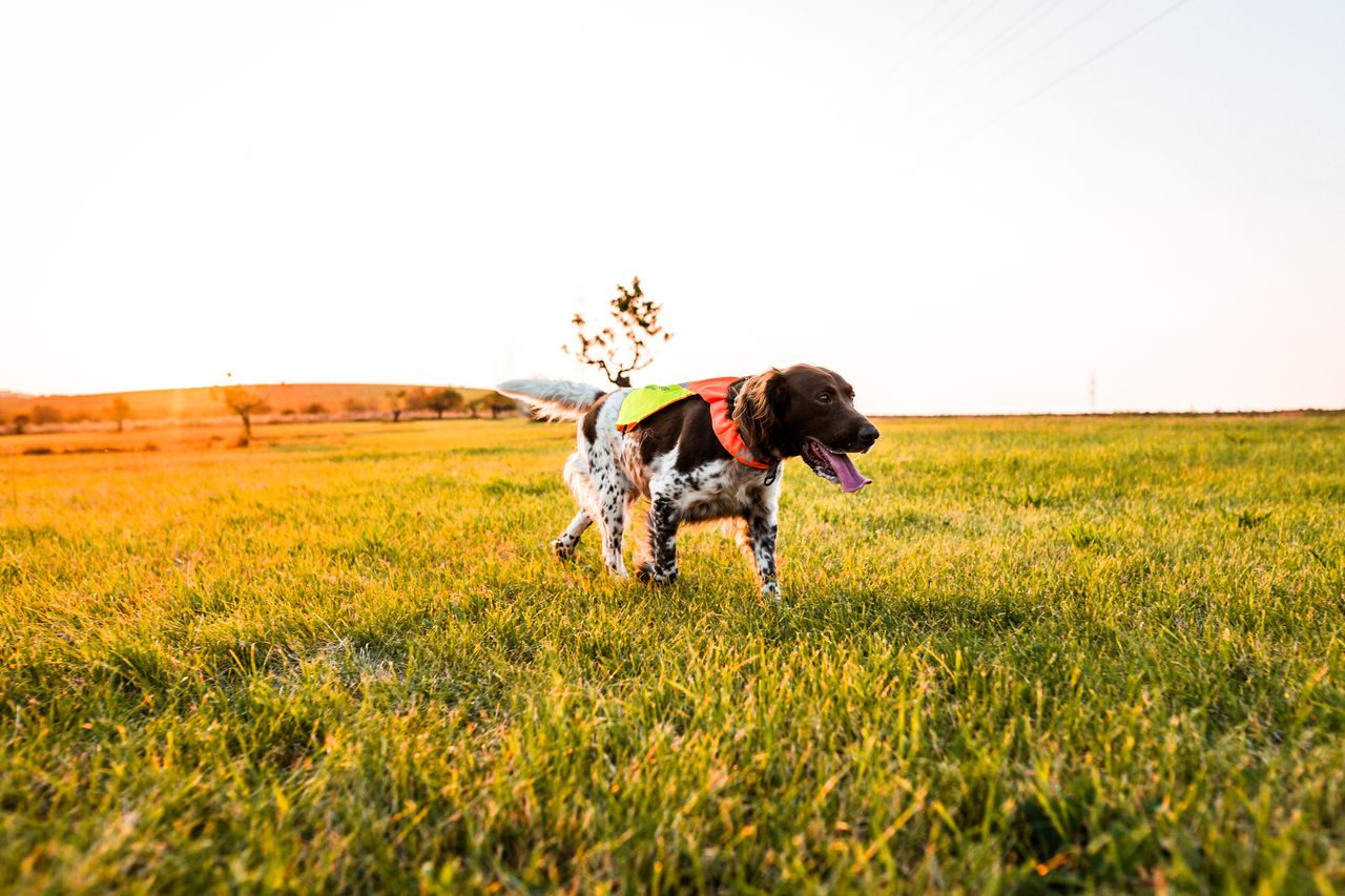 Vesti vasakul küljel on punase kangaga märgis ja paremal pool on erk kollane märgis – tänu sellele näete juba kaugelt kummale poole koer näitab.